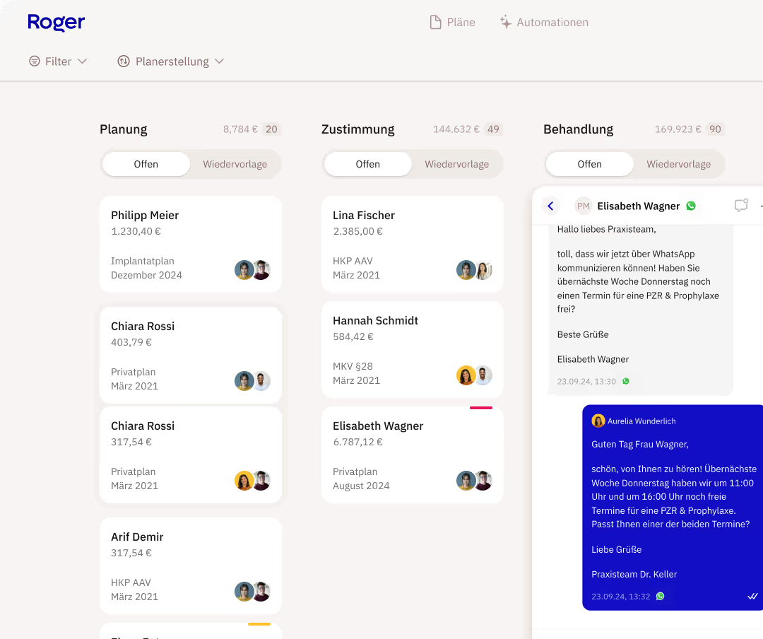 Roger ondersteunt tandartspraktijken met geautomatiseerde patiëntcommunicatie en behandelplanmanagement. Het platform fungeert als digitale assistent die via WhatsApp en SMS automatisch patiënten herinnert aan afspraken en openstaande behandelplannen, wat leidt tot 25% hogere acceptatie van behandelplannen en 10% minder gemiste afspraken. Roger integreert naadloos met bestaande praktijksystemen en bespaart tandartspraktijken tot 90 minuten per dag door tijdrovende administratieve taken te automatiseren.